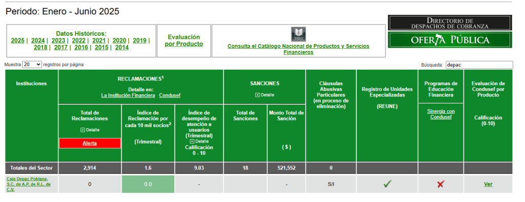 La información que consta de Caja Depac Poblana S.C. de A.P. de R.L. de C.V. en el Buró de Entidades Financieras con respecto a nuestro desempeño frente a los Usuarios, por la prestación de productos y servicios en el periodo: Enero – Junio 2025